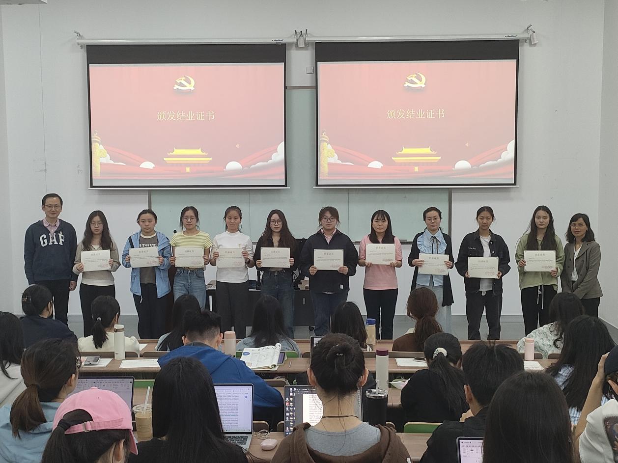 本期分党校全体学员通过考核,顺利结业。杨雪莲、朱晔为学员代表颁发结业证书和优秀学员证书,激励同学们不忘入党初心,在新的赶考之路砥砺前行。